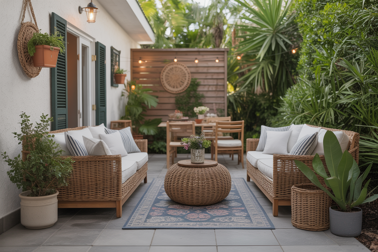 An outdoor rug helps mark the seating space clearly. It adds color and a cozy feel to the patio.