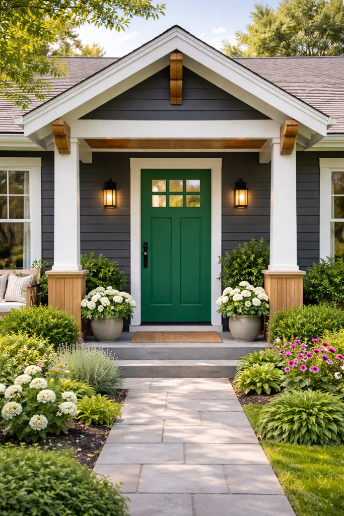 Gold or bronze hardware works wonderfully with forest green, adding a touch of elegance and luxury. Darker gray trim will create a sleek and polished look, while natural wood accents, such as a wooden front porch or shutters, will add warmth to balance the deep green color.