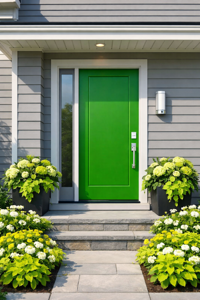 Kelly green offers a bold, striking contrast to gray siding, especially when paired with lighter or mid-tone grays. This color is perfect for homeowners who want to make a statement and add a touch of personality to their front door. It’s a great choice for homes with modern or contemporary designs, as well as for those looking to brighten up their exterior.